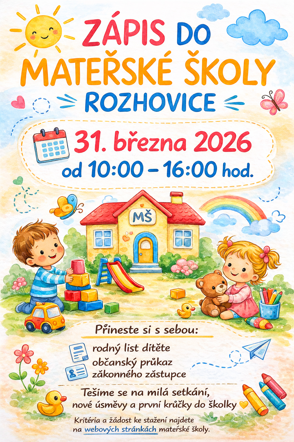 dovolujeme si Vás informovat, že dne 31. března 2026 proběhne zápis dětí k předškolnímu vzdělávání pro školní rok 2026/2027 do Mateřská škola Rozhovice.