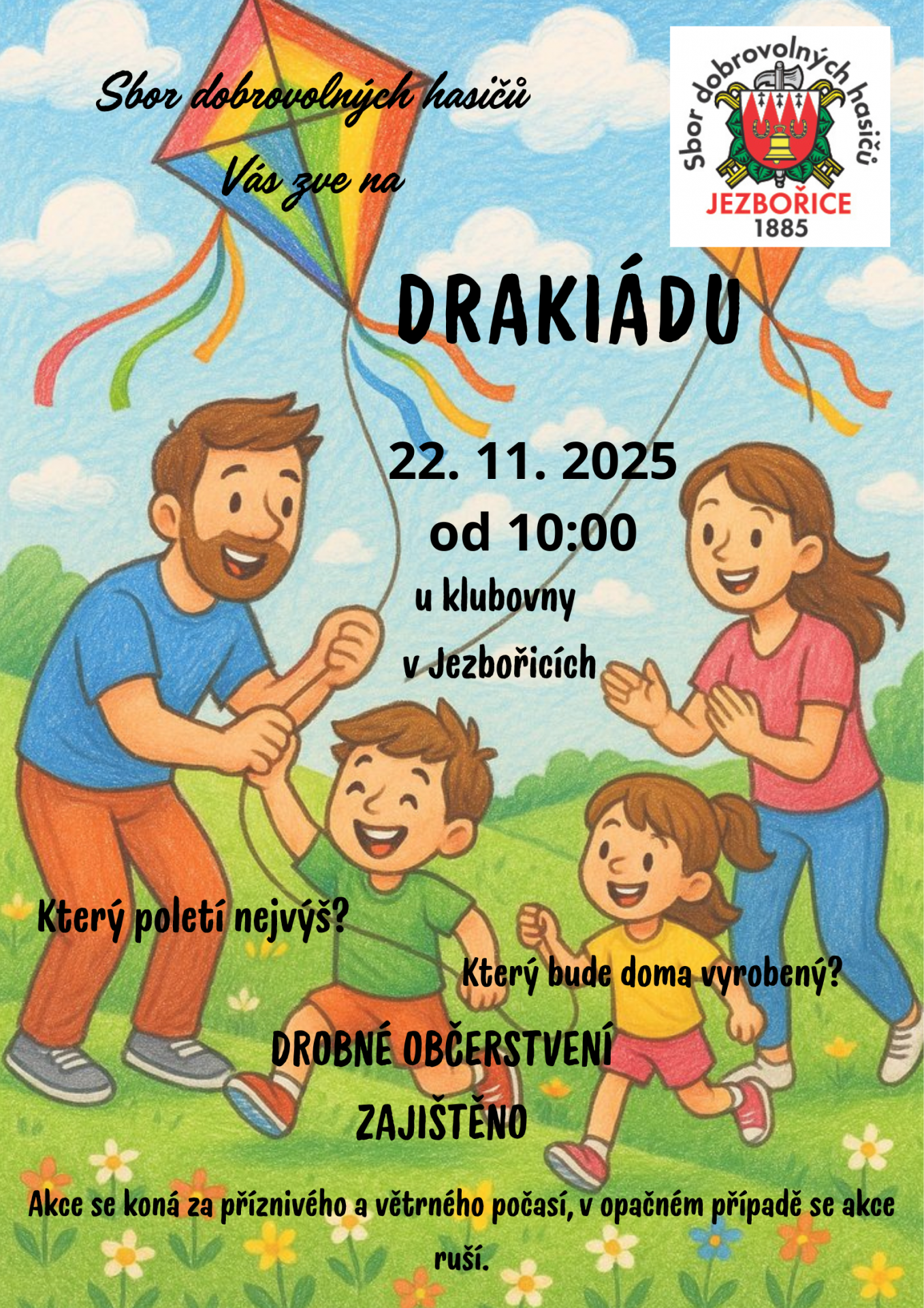 Sbor dobrovolných hasičů Vás zve ke klubovně na drakiádu, která se uskuteční 22.11. od 10:00 v případě příznivého počasí a hlavně větru ???️. Na místě bude možnost si zakoupit nějakou dobrotu a nebo se ohřát v klubovně